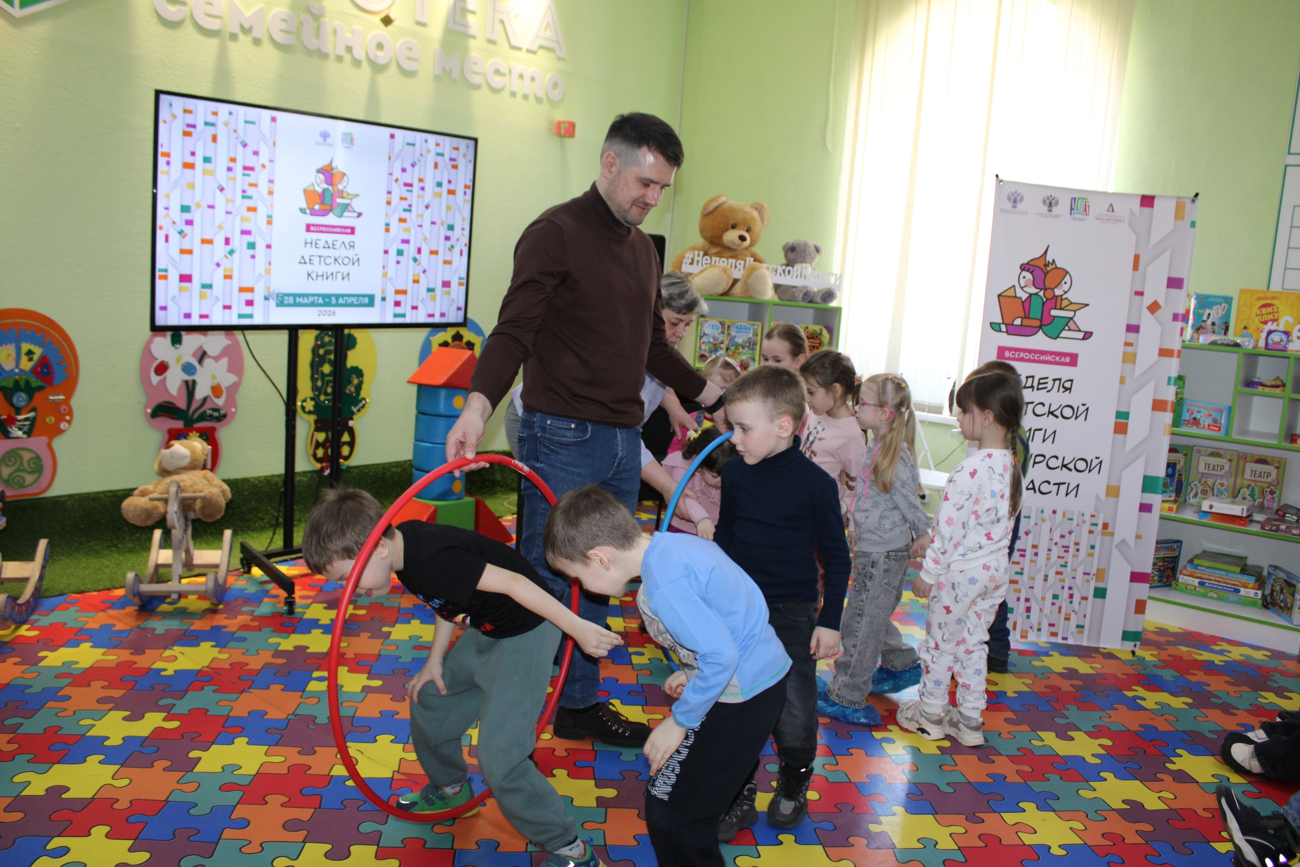 Неделя детской книги-2026. Сегодня в Игротеке «Семейное место» царила особая атмосфера — здесь собрались дошкольники из студии «Хочу всё знать» Дворца пионеров и школьников и воспитанники детского сада №3. Вместе с родителями они стали героями литературной Игротеки «Приключения на острове Чтения». Это было настоящее путешествие в мир книг! Дети решали литературные ребусы, принимали участие в конкурсах и викторинах, а мамы и папы с улыбкой поддерживали их, вспоминая любимые с детства книжные истории.